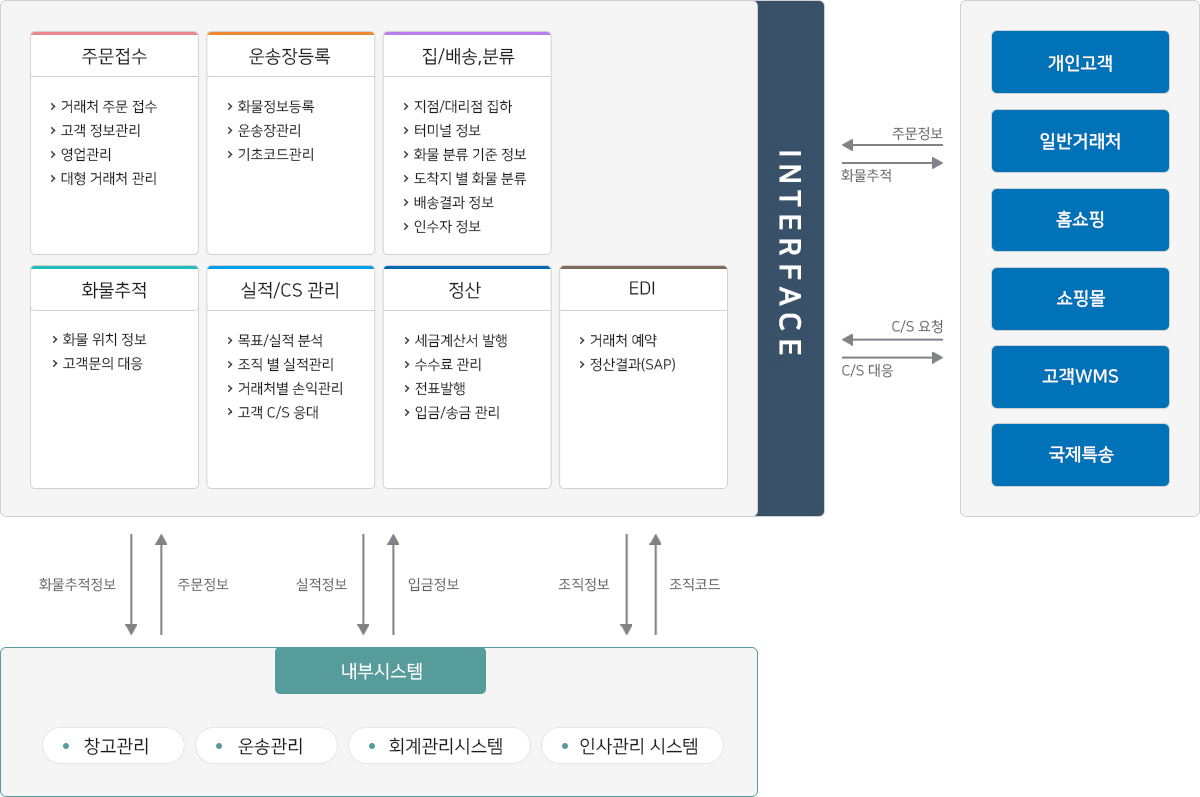 『e-PDS』의 택배시스템은 실시간 집/배송 주문 정보 처리 및 고객의 요구 사항에 응답하도록 최적화 되어 있으며, 효과적인 거래처 대응과 운영상 필요한 정보를 신속히 제공하며 각 업무특성을 고려하여 중점 업무인 주문접수, 거래처 , CS, 배송관리, 실적 그리고 정산에 이르기까지 업무 신뢰성을 높이며 더불어 외부기관과의 EDI 연계 모니터링과 I/F 지원을 통하여 업무 효율화를 제공합니다.