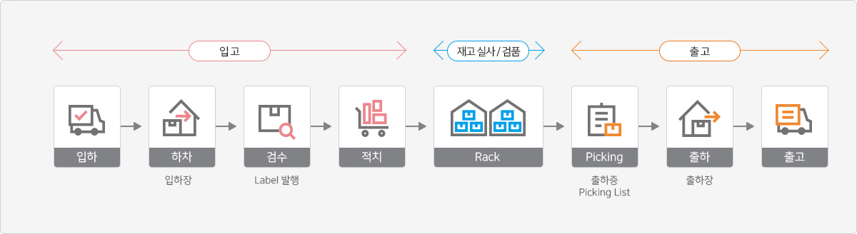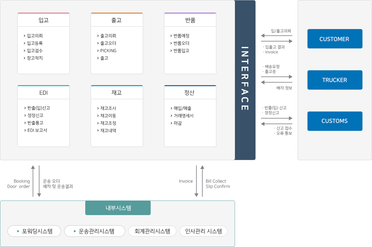 『E-WMS』물류센터의 보세(CFS) 창고, 일반창고, FTZ(유통가공) 등 다양한 업무지원, ERP, TMS, FIS, 홈페이지 등 단위 업무 시스템 상호간의 DATA Exchange, 외부 연관기관 (세관,선사,항공사,TML/YMS)과의 EDI 인터페이스 지원함으로써 업무의 편의 및 데이터 신뢰성을 극대화 하였으며 FTZ(Free Trade Zone) 물류센터에 적용가능 합니다.