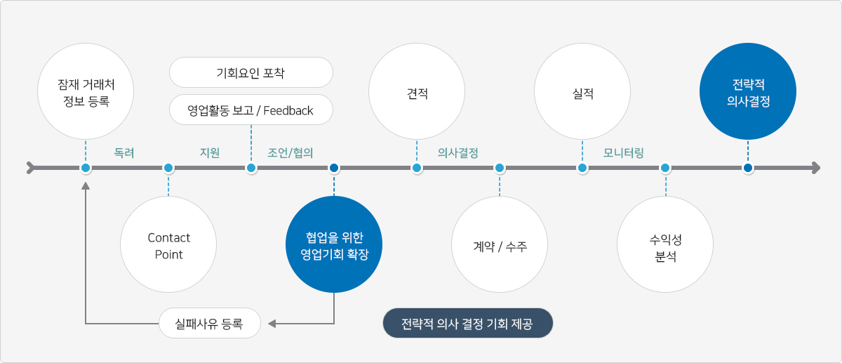 『E-CRM』는 정보 공유 기반 Internal Networking 활동 강화, 전략적 수익성 분석 Data 제공을 위한 “영업활동 관리체계” 구축 및 “전략적 의사 결정 지원 체계”를 제공합니다.