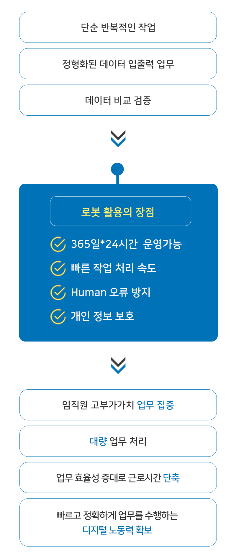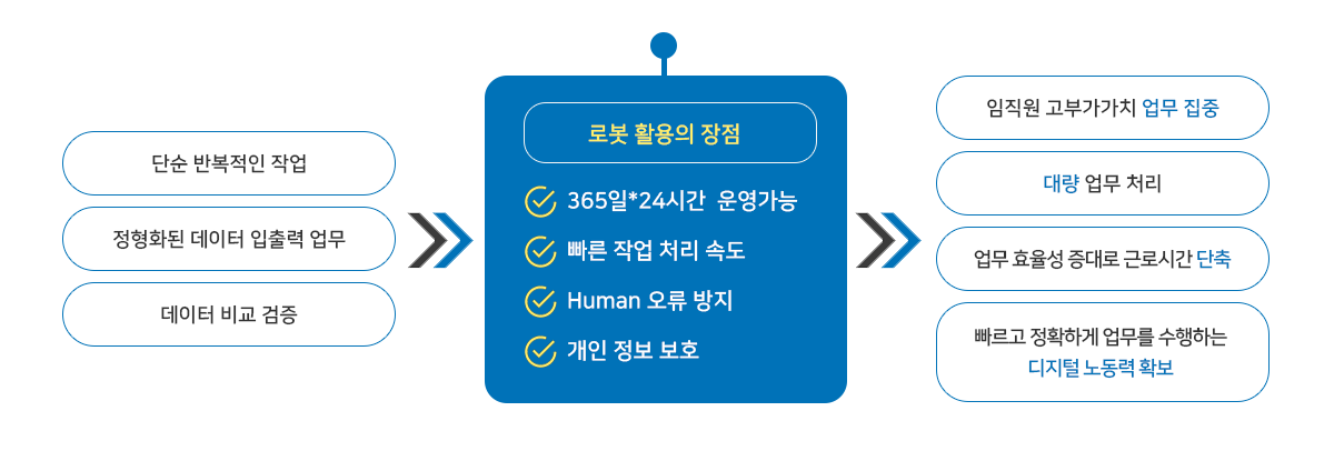 사람의 규칙적이고 반복적으로 처리해야 하는 업무 프로세스를 소프트웨어 로봇을 수행 하여 처리합니다. 일정한 패턴을 가지는 업무에 더욱 효율적으로 적용가능하며, 인공지능(AI) 초입 단계인 자동화 기술로서, 프로그래밍 보다는 복잡한 명령을 수행으로 비용 절감 및 생산성 향상 등을 가능하게 합니다.