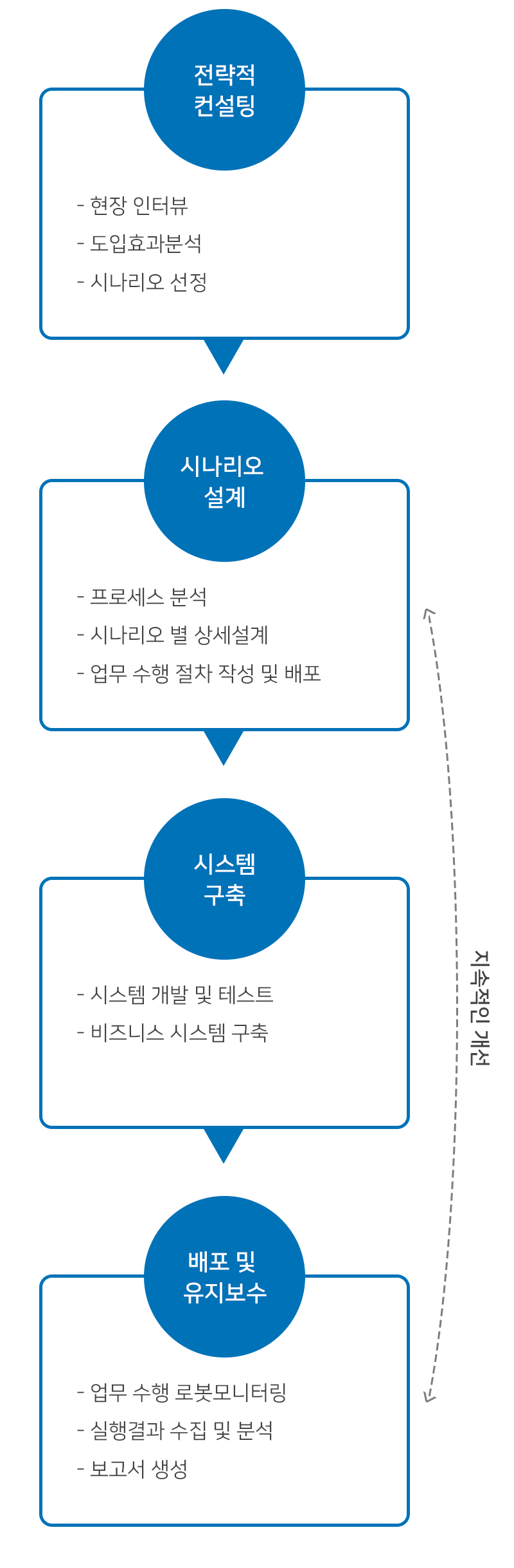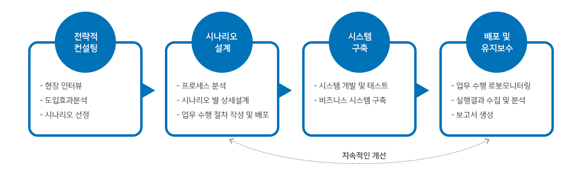 물류 업무 전문가를 통한 업무분석 및 설계하고 로봇이 수행할 수 있는 업무를 도출한 후 각각 업무별 프로세스를 구축합니다. 유지보수를 통하여 시스템 및 환경 변화에 적응하고 지속적인 개선을 위한 업무를 발굴하여 로봇에 적용합니다